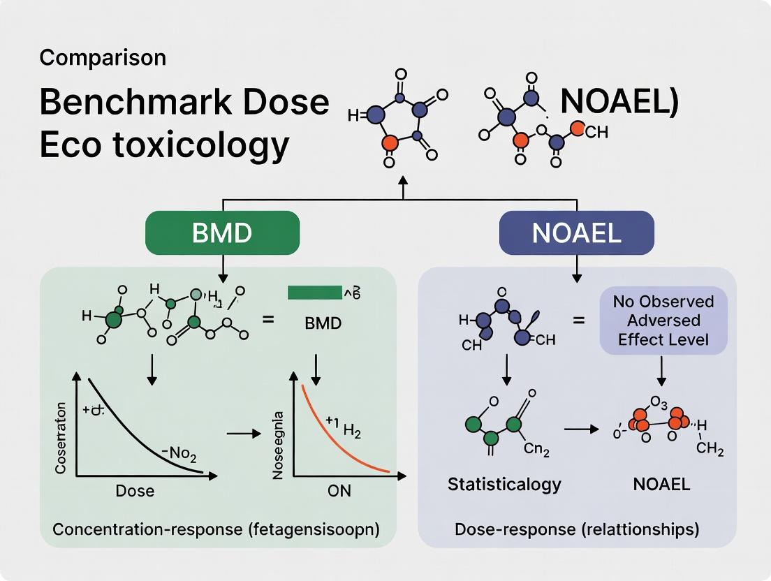 The transition from NOAEL to the Benchmark Dose represents a fundamental evolution in toxicological risk assessment, moving from a study-design-dependent observation to a statistically robust, data-driven modeling paradigm. The BMD framework provides a more scientifically defensible point of departure by utilizing the complete dose-response curve, quantifying uncertainty, and enabling consistent comparisons across studies and chemicals. While methodological choices and data requirements present challenges, advancements like Bayesian model averaging and standardized software are streamlining implementation. Critically, comparative analyses validate that BMD provides similar or more protective points of departure than NOAEL, with the added benefit of extracting more information from existing studies, thereby supporting the refinement of animal testing. The future of the field lies in the continued harmonization of BMD approaches globally, the expansion into epidemiological data integration[citation:6], and its confluence with next-generation frameworks like Adverse Outcome Pathways (AOPs) and biologically based models for a truly mechanistic risk assessment[citation:1]. For researchers and regulators, embracing and mastering the BMD methodology is essential for advancing the precision, transparency, and predictive power of modern biomedical and environmental safety evaluations.